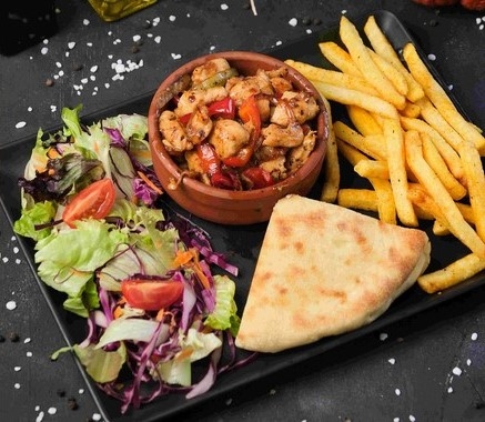 TAVUK GÖĞSÜ 220 GR , KAPYA VE ÇARLİSTON BİBER , SOĞAN , PUL BİBER , KEKİK , KARABİBER , AKDENİZ YEŞİLLİK , GÖBEK MARUL , HAVUÇ ,CHERRY DOMATES , BAZLAMA EKMEĞİ , PATATES KIZARTMASI , TOZ TAVUK BULYON