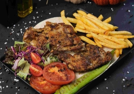 TAVUK PİRZOLA 2 ADET , ÇARLİSTON BİBER , DOMATES , LAVAŞ , SIVIYAĞ , TUZ , PATATES KIZARTMASI , AKDENİZ YEŞİLLİKLERİ