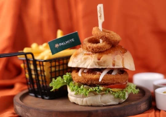 TAVUK GÖĞSÜ 90 GR , HAMBURGER EKMEĞİ , PATATES KIZARTMASI 100 GR , DOMATES , SOĞAN , MARUL , KORNİŞON TURŞU , KETÇAP VE MAYONEZ , GALETA UNU , 1 ADET YUMURTA , 2 ADET SOĞAN HALKASI