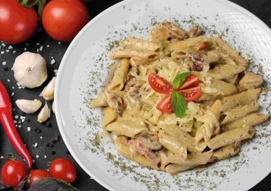PENNE 275 GR , TAVUK GÖĞSÜ 220 GR , KAPYA VE ÇARLİSTON BİBERİ , MANTAR , KREMA , PESTA SOS , SIVI YAĞ , TUZ , KAŞAR PEYNİRİ