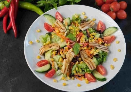 AKDENİZ YEŞİLLİKLERİ , HELLİM PEYNİRİ ( 90 GR ), DOMATES VE SALATALIK ( 50 GR ) , MISIR ( 30 GR ) , CHEERY DOMATES ( 25 GR ) , NANE