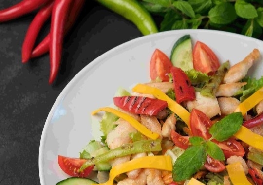 tavuk göğsü (220 gr ),sezar sos 25 gr ,cheddar peyniri 1 dilim, kaşar 10 gr , cherry domates 4 adet ,kapya biber 35 gr , çarliston biber 35 gr , domates ve salatalık 50 gr , marul( akdeniz yeşillikleri ) 150 gr