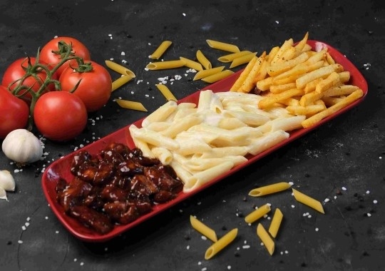TAVUK GÖĞSÜ (220 GR ) , BARBEKÜ SOS ( 40 GR ) , PENNE ( 150 GR HAŞLANMIŞ AĞIRLIĞI ) , KREMA (50 GR ) , TOZ TAVUK BULYON ( 3 GR ) , PATATES KIZARTMASI ( 100 GR ) , TUZ ( 3 GR ) , SIVIYAĞ ( 5 CL )