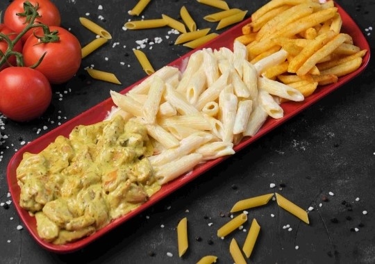 220gr tavuk, köri, patates kızartması, kremalı penne