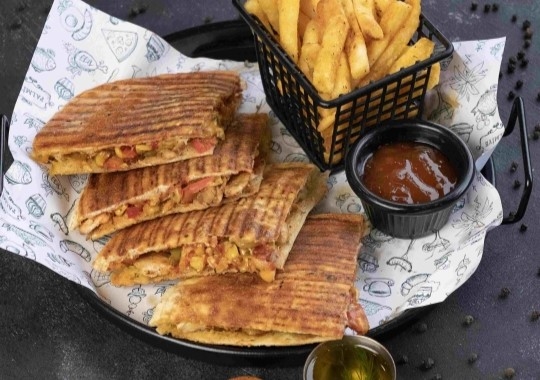 TAVUK GÖĞSÜ 100 GR , ÇARLİSTON BİBER 35 GR , KAPYA BİBER 35 GR , MISIR 20 GR , TUZ, KEKİK, PUL BİBER , TOZ KIRMIZI BİBER , KARABİBER , SALÇA , CHEDDAR PEYNİRİ , PATATES KIZARTMASI , SWEET CHİLİ SOS 25 GR , SOĞAN 10 GR