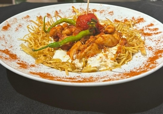 200gr tavuk, 30gr napoliten sos, kekik, tuz, kibrit patates, sarımsaklı yoğurt, kıl biber, çeri domates