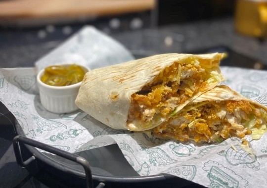 tortilla, 3 adet çıtır tavuk, burger sos, mayonezli marul, patates kızartması, kaşar