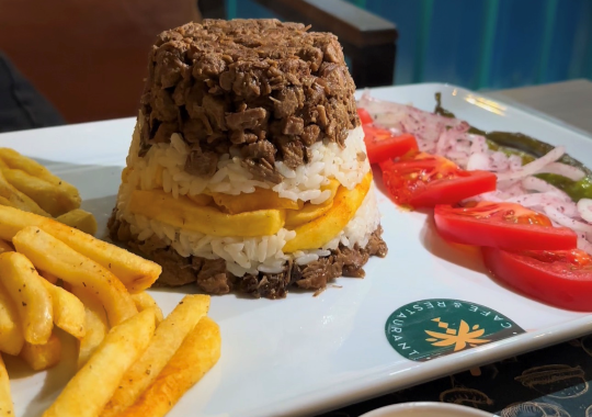 300 gr kavurma, 100gr patates kızartması,100 gr pirinç pilavı, sumaklı soğan, domates, 2 kıl biber, kekik